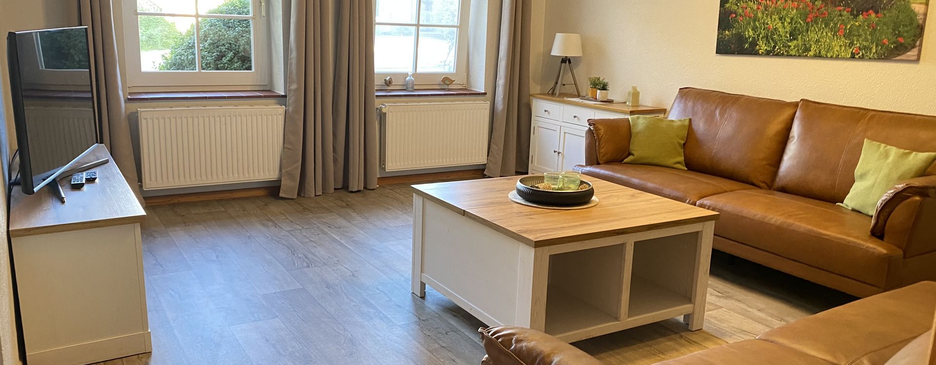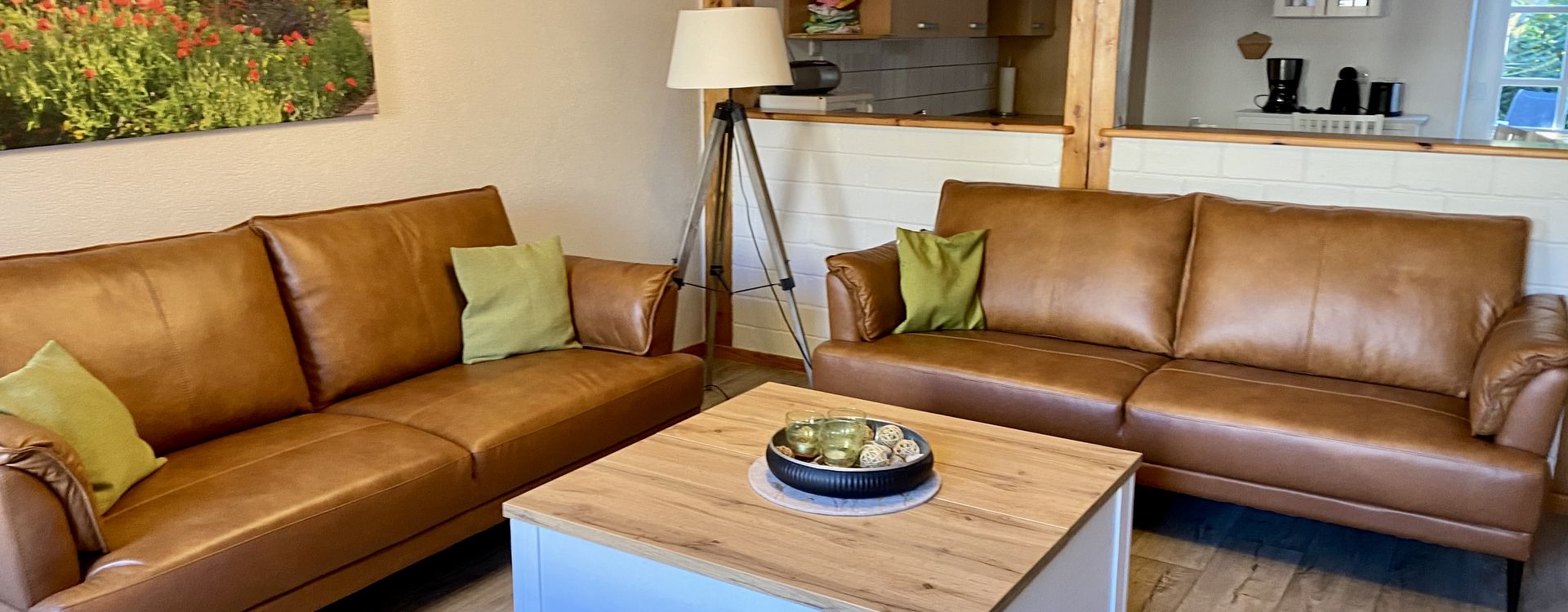 Im Erdgeschoss befinden sich eine vollausgestattete Küche mit großem Esstisch und mit Zugang zur Terrasse, ein gemütliches Wohnzimmer und ein Gäste-WC im Erdgeschoss.